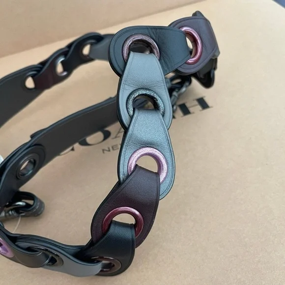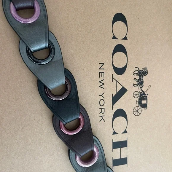 Enhance your bag with this Coach glovetanned leather strap featuring a stylish mix of gray, pink leather and metal links. With adjustable straps and dogleash clip hardware for versatile compatibility, this strap complements various styles.- Material: Glovetanned leather- Length: 42.5”, adjustable- Color: Gray and pink- Details: Alternating gunmetal and pink metal grommet- Hardware: Gunmetal dogleash clips- Condition: New with tags- Care: Spot cleanCoach crossbody strap, leather bag strap, Coach replacement strap, gray pink Coach strap, glovetanned leather strap, metal link bag strap, Crossbody, back straps, replacement, coach, mother, adjustable, accessories, neutral colors