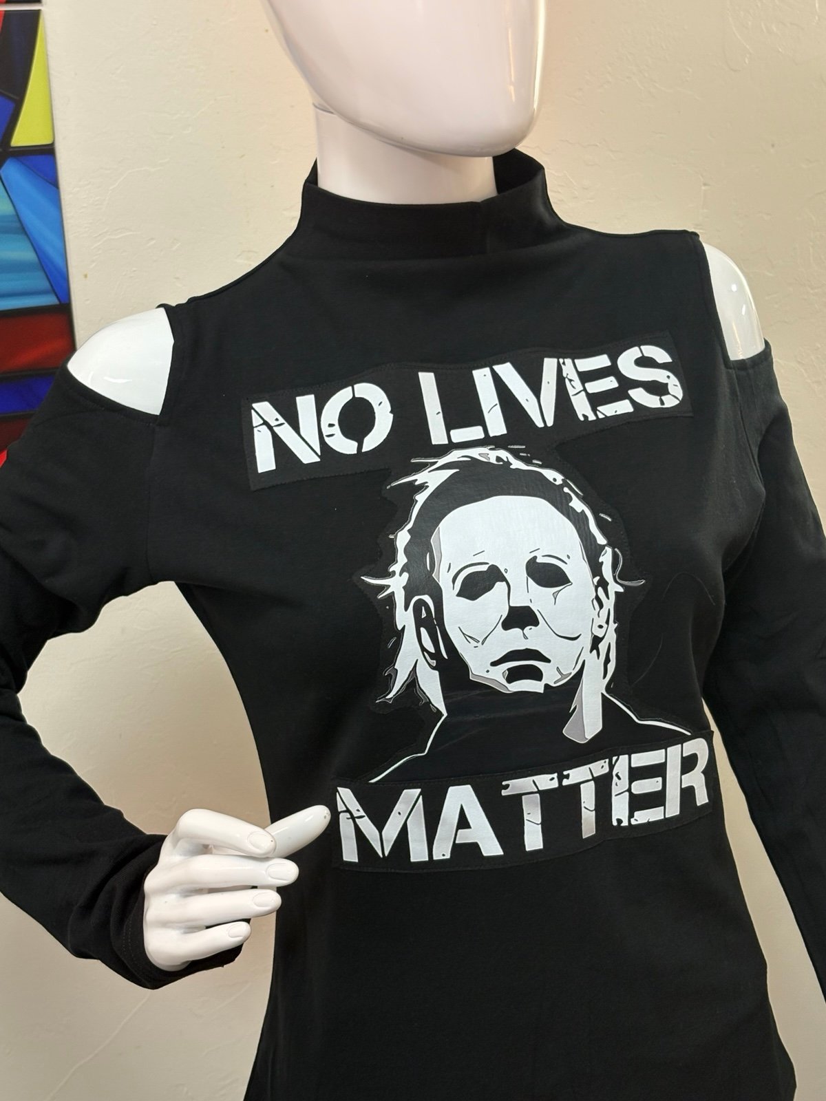 Handmade original design, and definitely not just for Halloween! I created this piece using 4 different shirts! I cut out the graphics, handcrafted them into iron ons, precision cut, rearranged and layered, iron pressed and finally sewing machine stitched for quality, originality and professional finish! One of a kind, I used my sewing machine to stitch around all the graphics in contrasting and complimentary colors to amp up the total detail and design
