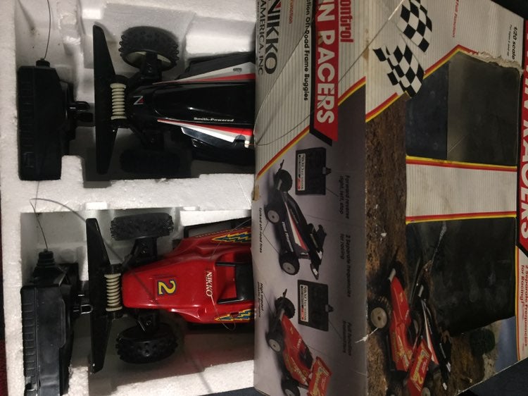 Nikko Radio Control Twin Racers (Parts Repair). Vintage set. Very sturdy plastic. There is no visible damage but they do not run. Should be quick to get it up and running. Both remotes are included. Batteries not included Not cheap thin plastic of the 90s.