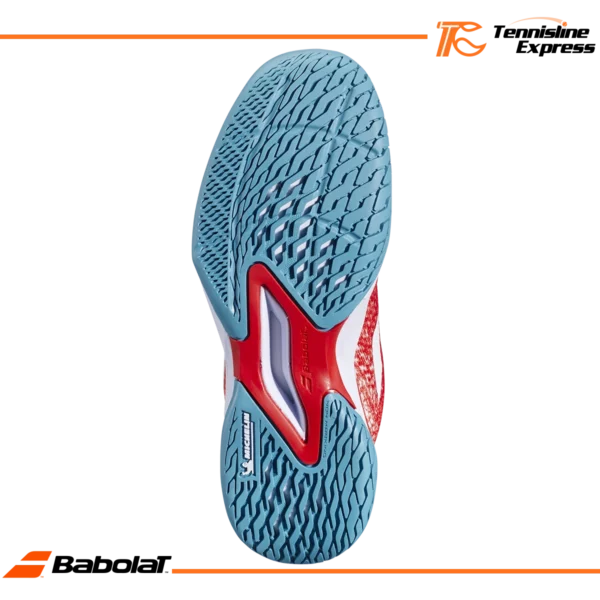 La semelle a été repensée pour répondre plus précisément aux sollicitations du jeu : la surface de la sculpture a été augmentée dans les zones les plus sollicitées en abrasion et allégées dans les zones les moins sollicitées. La semelle JET MACH 3 Jr associée à la technologie Michelin offre ainsi une durabilité accrue pour réduire l’usure et l’abrasion liés aux déplacements spécifiques du tennis.